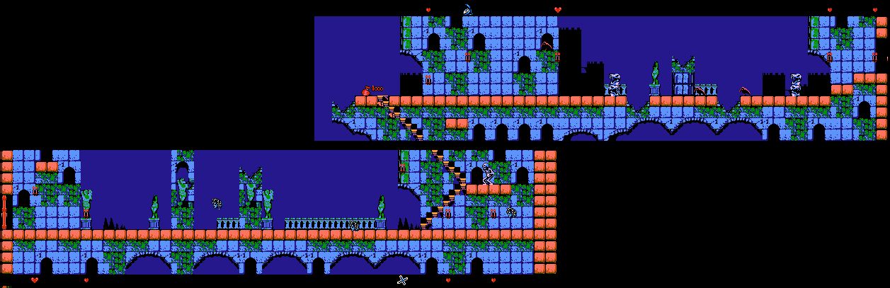 Drogę zablokuje nam wzniesienie, na które nie możemy wskoczyć. Zanim jednak zejdziemy niżej, warto rozwalić dół wzniesienia - jest tam ukryte mięso, które zregeneruje nam 6 HP. Potem schodzimy po schodach na dół. To jest bardziej męczący fragment. Musimy uważać, aby nie spaść do wody - to oznacza automatyczną śmierć. Ryboludzie są wkurzający z ich nagłym wyskakiwaniem z wody. W świeczniku przy pierwszej dziurze jest nowa broń specjalna - zegar, który na pewien czas zatrzymuje czas - przyda się nam przy przechodzeniu tej lokacji. W południowo-wschodnim rogu jest ukryta dodatkowa torba z pieniędzmi, zaś w północno-wschodnim rogu, zaraz przy wyjściu - krzyż.